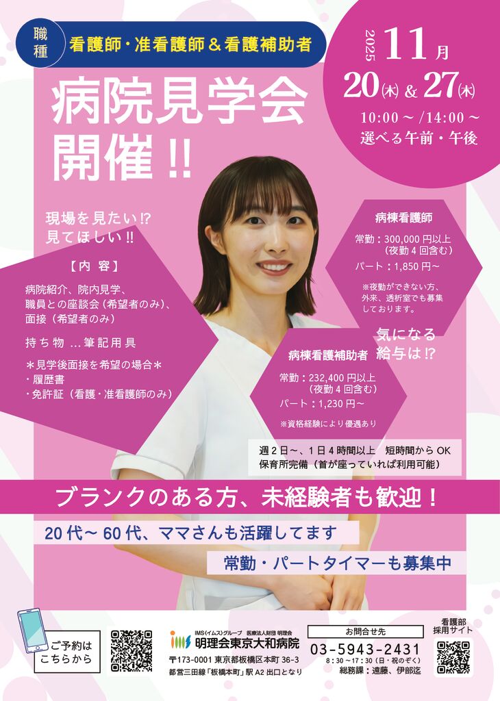 明理会東京大和病院では、看護師・准看護師・看護補助者を対象にした「病院見学会」を開催します。