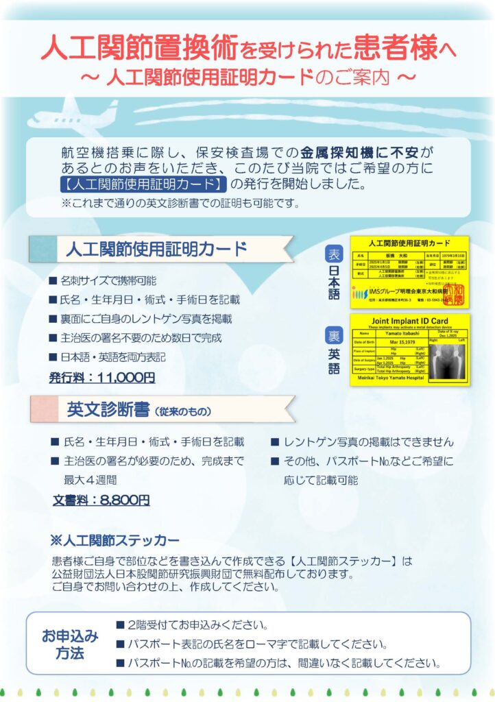 年末年始に飛行機を利用される予定の方、大規模イベントやテーマパークにお出かけされる予定の方で、保安検査用に当院の人工関節使用証明カードをご希望の患者様はお早めにお申し込みください。