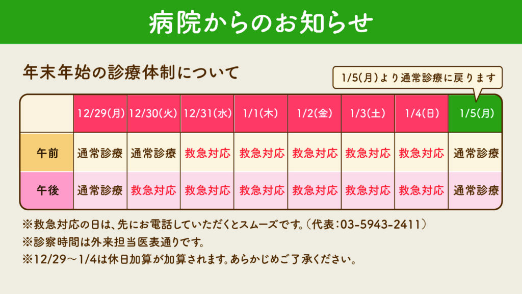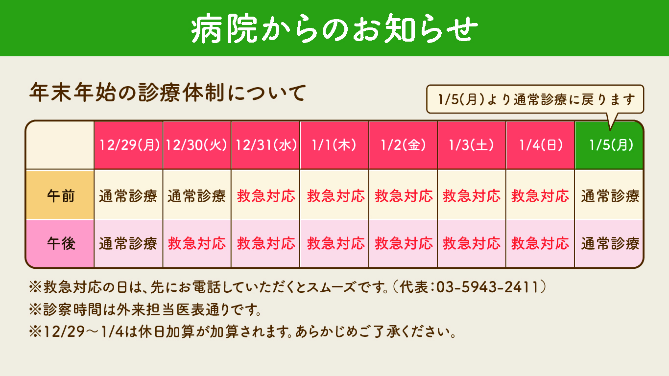 平素より当院をご利用いただき、誠にありがとうございます。年末年始の外来診療は、下記の通りとさせていただきます。