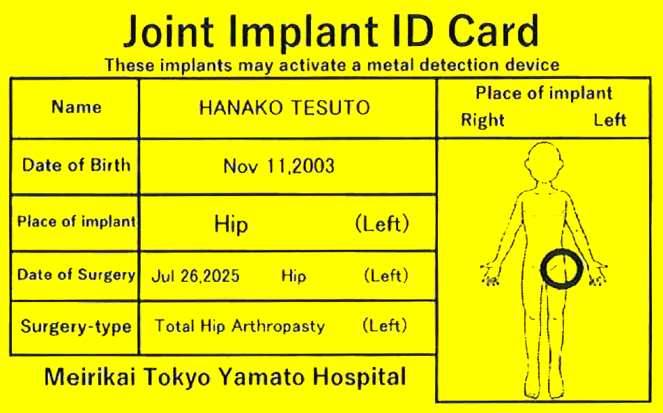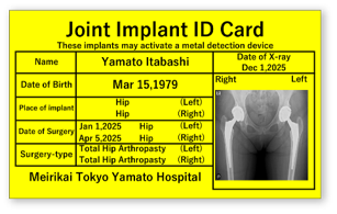 航空機搭乗に際し保安検査場での金属探知機に不安があるとのお声をいただき、当院ではご希望の方に【人工関節使用証明カード】の発行を行っています。